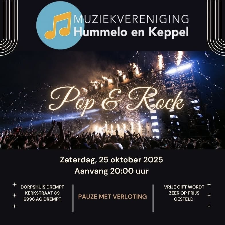 Muziekvereniging Hummelo en Keppel nodigt iedereen uit om te komen luisteren en kijken naar het najaarconcert 2025. Dit keer met het thema Pop & Rock. U bent van harte welkom op zaterdagavond 25 oktober in Dorpshuis Drempt. Het optreden begint om 20:00 uur.